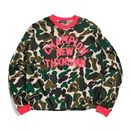 Long sleeve sweatshirt in boxy fit. Features camo pattern and front print. Made from cotton fabric with ribbed collar and cuffs. Suitable for daily or casual wear.
