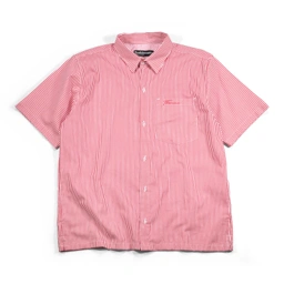 A classic striped short-sleeve shirt with a boxy fit, front pocket, button-up design, and embroidery detail.