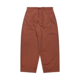 Super-baggy brown twill pants with pleated front seam lines and cropped wide-leg fit. Features minimalist welt back pockets and signature bow embroidery on the right rear. Finished with clean tonal stitching and subtle waistband construction.