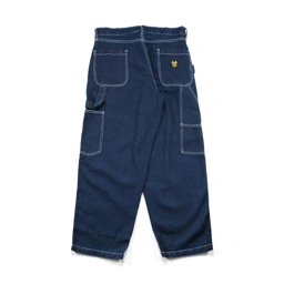 A denim carpenter pant with belt loops, buttons, and zip closure, side pockets, back patch pockets, a cargo pocket on the leg, a hammer loop on the side, and a brand logo label on the back pocket.