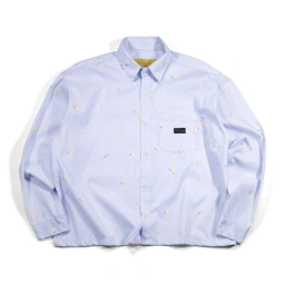 A classic long shirt with a loose boxy fit, a front pocket, and a button-up design.