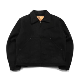 Black jacket made from twill raffel/rafel fabric. Front zip closure with collar. Two front hand pockets with rivet detail and one slanted chest pocket. Adjustable waist tabs with button.