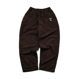 Bow Cord Pants in with drawstring waist. Features front bow embroidery and back monogram detail. Made with cotton blend and straight leg cut. Suitable for daily wear and casual settings.