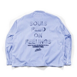 A striped long-sleeve shirt with a boxy cut, button-up closure, and front chest pocket. Detailed with a printed graphic at the back.