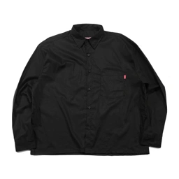 Boxy long shirt with classic collar, single chest pocket, and button closure.