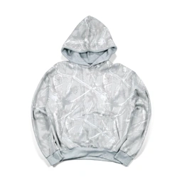 Hooded sweatshirt with light grey camo pattern. Features front pocket and ribbed cuffs and hem. Cotton fabric with boxy fit. Suitable for daily or casual wear.