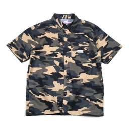 Short sleeve shirt made from cotton fabric with a front button closure.