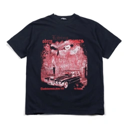 Kaos lengan pendek dengan hasil washed serta detail distress (sobek-sobek) pada bagian leher, lengan, dan bawah baju. Dilengkapi sablon grafis di bagian depan. Terbuat dari bahan katun dengan potongan boxy fit.