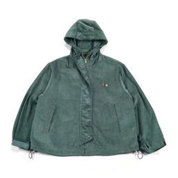 Hooded jacket with full front zipper and snap button closure, adjustable hem, side pockets, and embroidery detail.
