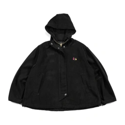 Hooded jacket with full front zipper and snap button closure, adjustable hem, side pockets, and embroidery detail.
