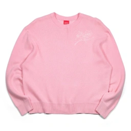 Crew neck knit sweater with long sleeves. Features ribbed collar, cuffs, and hem.