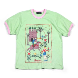 Short sleeve t-shirt with boxy fit. Features colorful front graphic and contrast rib on collar and sleeves. Made from cotton fabric. Suitable for daily wear.
