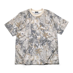 Short-sleeve T-shirt featuring an all-over nature camouflage print with neutral earth tones. Made from soft cotton fabric with a comfortable regular fit.