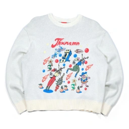 Crew neck knit sweater with long sleeves. Features ribbed collar, cuffs, and hem.