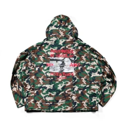 Unisex hooded jacket with all-over camouflage pattern. Front zip closure with snap-button placket. Multiple front flap pockets and adjustable hood with drawstring. Graphic print placed on the back panel. Material: Twill