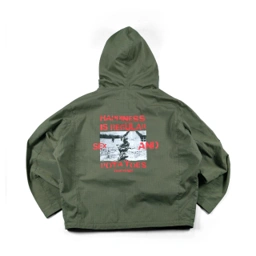 Unisex hooded jacket with solid construction. Front zip closure with snap-button placket. Multiple front flap pockets and adjustable hood with drawstring. Graphic print placed on the back panel. Material: ripstop cotton fabric.