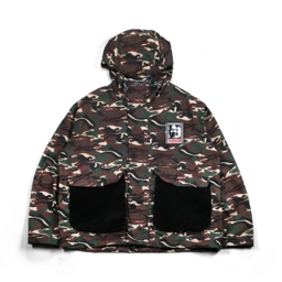 A hooded field-style jacket with a relaxed silhouette, constructed from printed cotton fabric in a camo pattern. Designed with a button and zip front closure for secure layering, and oversized front pockets finished with contrasting corduroy panels. The back features a bold graphic print.