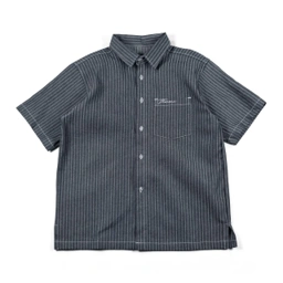 Unisex short-sleeve shirt with a vertical stripe pattern. Features a chest pocket with embroidery logo and a classic button-up construction. Material: Raw Denim 8oz