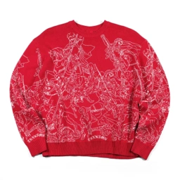 Crew neck knit sweater with long sleeves. Features ribbed collar, cuffs, and hem.