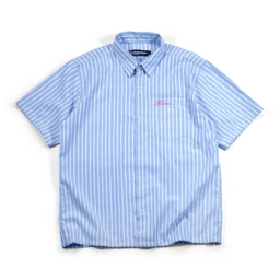 A classic striped short-sleeve shirt with a boxy fit, front pocket, button-up design, and embroidery detail.