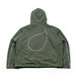 Olive ripstop jacket with four front flap pockets and a center zipper. The back and sleeves feature studded teardrop detailing as the main highlight. Slightly loose fit and comfortable for everyday wear. Material: Ripstop