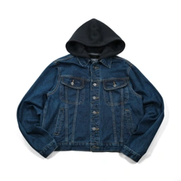 A classic denim jacket updated with a built-in hood for an easy, layered look. This piece brings a relaxed, urban vibe to a rugged staple, making it a go-to choice for effortless daily style.