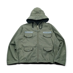 A versatile hooded jacket that balances utility with artisanal detail. This olive green ripstop piece features custom manual hand-stitching on the back, creating a unique, one-of-a-kind graphic that stands out.