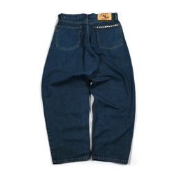 Super baggy denim pants feature a relaxed fit with wide legs and an studded patch. The classic five-pocket design includes front and back pockets, along with a small coin pocket.