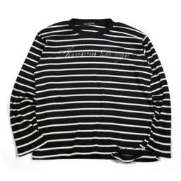 Kaos lengan panjang berbahan waffle knit dengan motif garis hitam putih. Menggunakan print grafis di bagian dada serta detail sobek dan lubang kecil yang disengaja pada area leher dan bagian bawah.