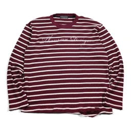 Kaos lengan panjang berbahan waffle knit dengan motif garis hitam putih. Menggunakan print grafis di bagian dada serta detail sobek dan lubang kecil yang disengaja pada area leher dan bagian bawah.