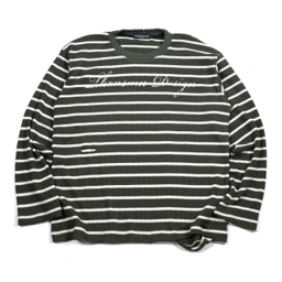 Kaos lengan panjang berbahan waffle knit dengan motif garis hitam putih. Menggunakan print grafis di bagian dada serta detail sobek dan lubang kecil yang disengaja pada area leher dan bagian bawah.