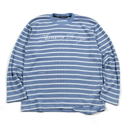 Kaos lengan panjang berbahan waffle knit dengan motif garis hitam putih. Menggunakan print grafis di bagian dada serta detail sobek dan lubang kecil yang disengaja pada area leher dan bagian bawah.