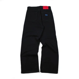 Loose fit straight denim pant. Five pocket construction with metal rivets and zipper fly. Back pocket finished with signature blue label.