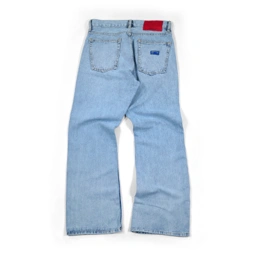 Flared denim pants with a relaxed silhouette, contrast stitching, and classic five-pocket construction. Finished with signature THXNSMN DESIGN® woven patch at the back waistband.