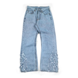 Bootcut denim pants with five-pocket construction and belt loops. Button and zipper fly closure. Distressed stitch detailing on lower leg panels.