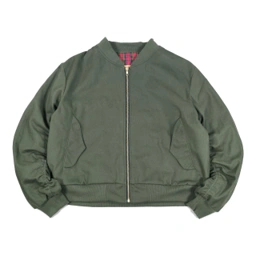 Bomber jacket with front zip closure and rib collar. Rib hem and rib cuffs. Side pockets with stitched opening. Gathered sleeve construction. Inner lining with plaid fabric.