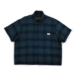 Boxy Short Sleeve Shirt, relaxed cut, dropped shoulder, button front closure, single chest pocket with woven label, soft plaid fabric. Clean shape, easy layer. Material: Flannel