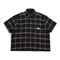 Boxy Short Sleeve Shirt, relaxed cut, dropped shoulder, button front closure, single chest pocket with woven label, soft plaid fabric. Clean shape, easy layer.