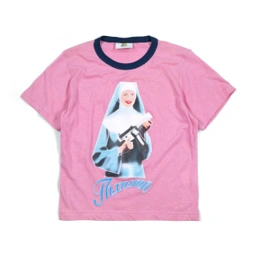 Fitted women’s t-shirt with a body-contouring silhouette. Features a front graphic print as the main design element.