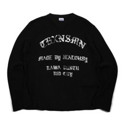 Crew neck knit sweater with long sleeves. Features ribbed collar, cuffs, and hem.