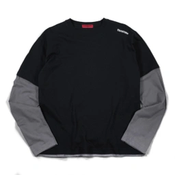 Layered long sleeve t-shirt with graphic print on the front. Double sleeve construction featuring a short sleeve outer layer and contrast long sleeve inner layer. Crewneck collar with straight hem.