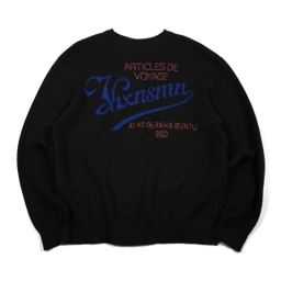 Crew neck knit sweater with long sleeves. Features ribbed collar, cuffs, and hem.