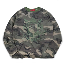 Long sleeve with all-over camo print. Front crest graphic. Ribbed collar. Label detail on neck.
