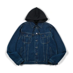 Denim jacket with hood layer, drawcord, and cross metal charm detail.