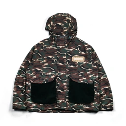 Boxy-fit hooded jacket featuring a classic camo pattern with utility-inspired details. Designed with a wide silhouette for a relaxed and structured look.