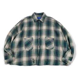 Flannel shirt with plaid pattern, oversized fit, and boxy cut.