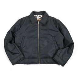 Boxy jacket with front zip closure, side pockets, inner lining, collar design, & straight hem. Material: Nylon Fabric