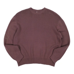 Crew neck knit sweater with long sleeves. Features ribbed collar, cuffs, and hem.