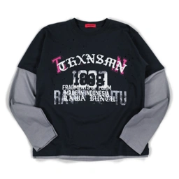Layered long sleeve t-shirt with graphic print on the front. Double sleeve construction featuring a short sleeve outer layer and contrast long sleeve inner layer. Crewneck collar with straight hem.