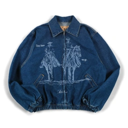 Denim jacket with zip closure and collar design. Features artwork detail on the front panel with elastic hem and cuffs.